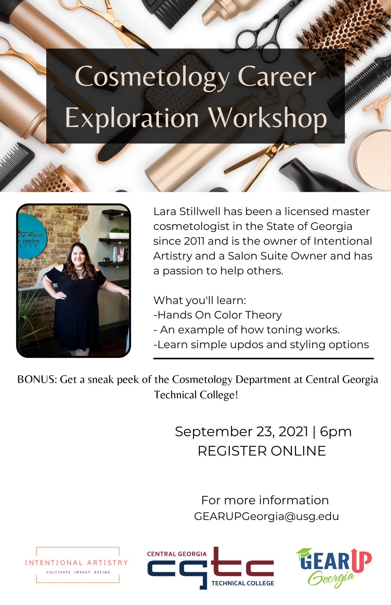 Join GEAR UP Georgia and the Central Georgia Technical College Cosmetology program. Learn how to use federal and state financial aid grants to help pay for school in cosmetology. Students will receive hands-on cosmetology instruction in color theory and up-do techniques.