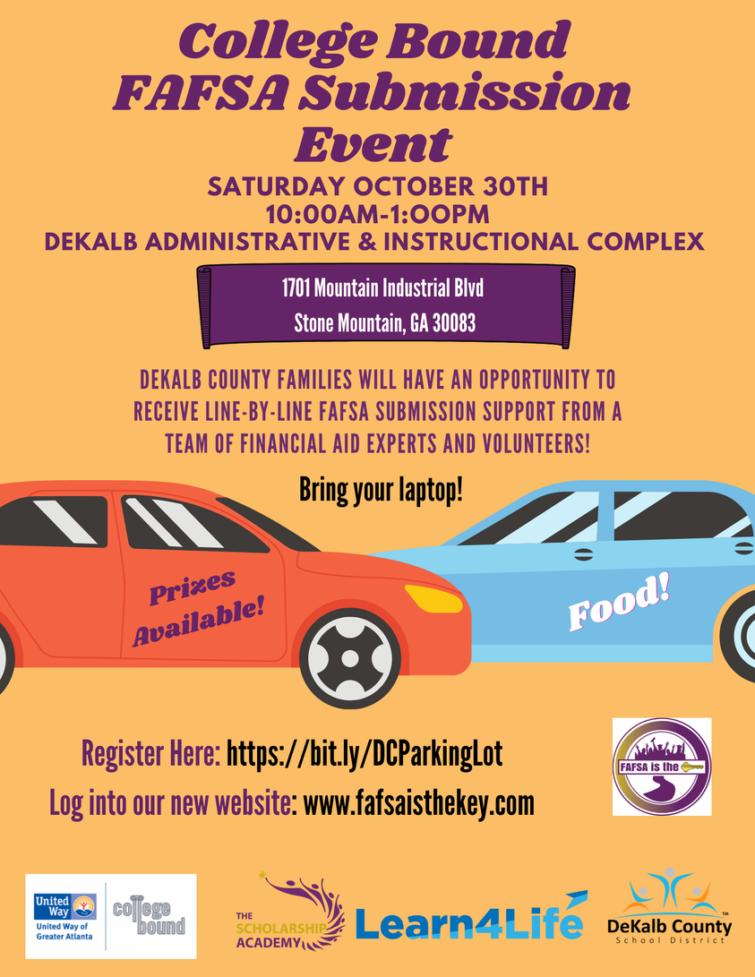 Don’t miss out Dekalb County Students and Families! Come out on October 30th to receive expert and volunteer assistance on how to successfully submit your FAFSA and get your free money!